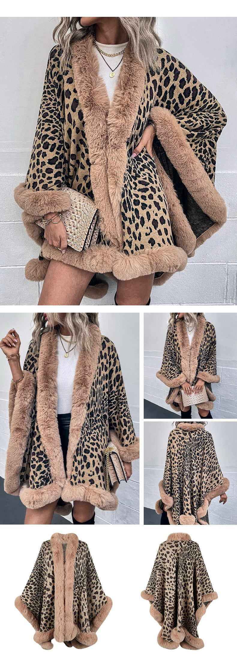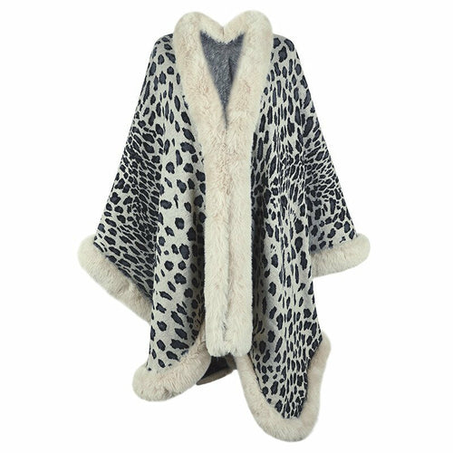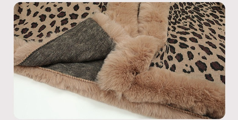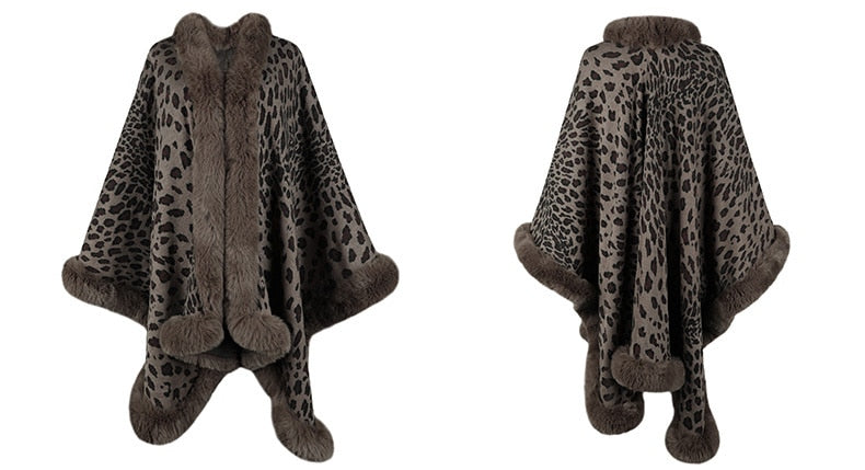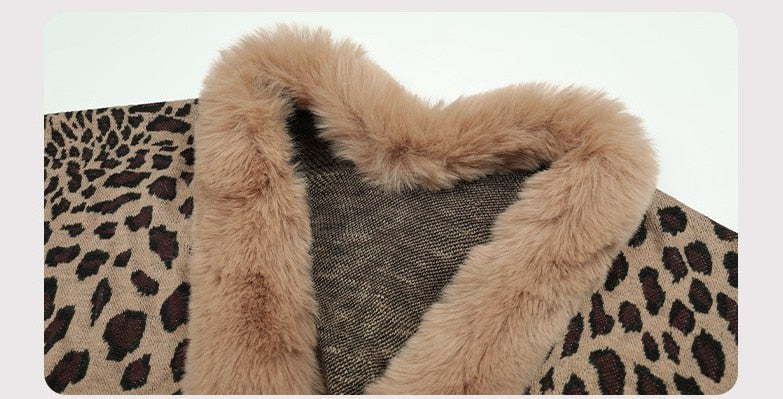 2022 Winter Thick Warm Poncho Fur Collar Cape Coat Women Vintage Leopard Sweater Cardigan Female Batwing Sleeve Shawl