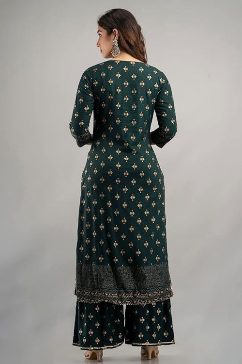 Green Rayon Gold Printed Straight Kurta with Sharara and Dupatta set