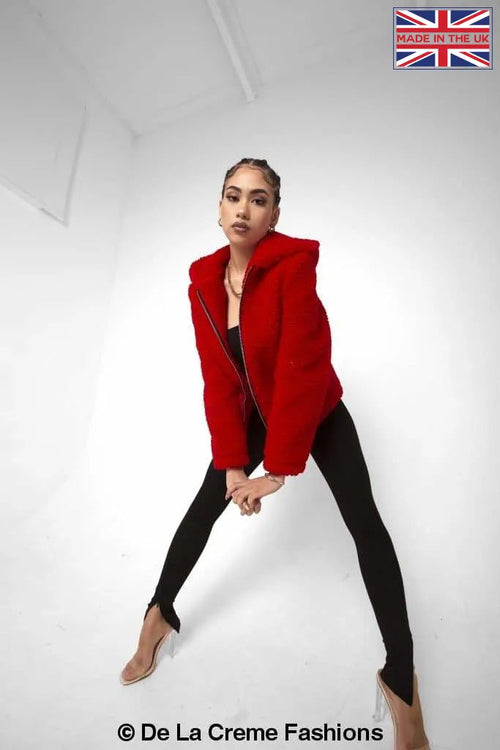 A hip length hooded coat with borg teddy finish. Available in many colours and comes from sizes UK 8 - 20. Fabric from Italy. Made in England. Fully lined inside. Features Zip fastening.