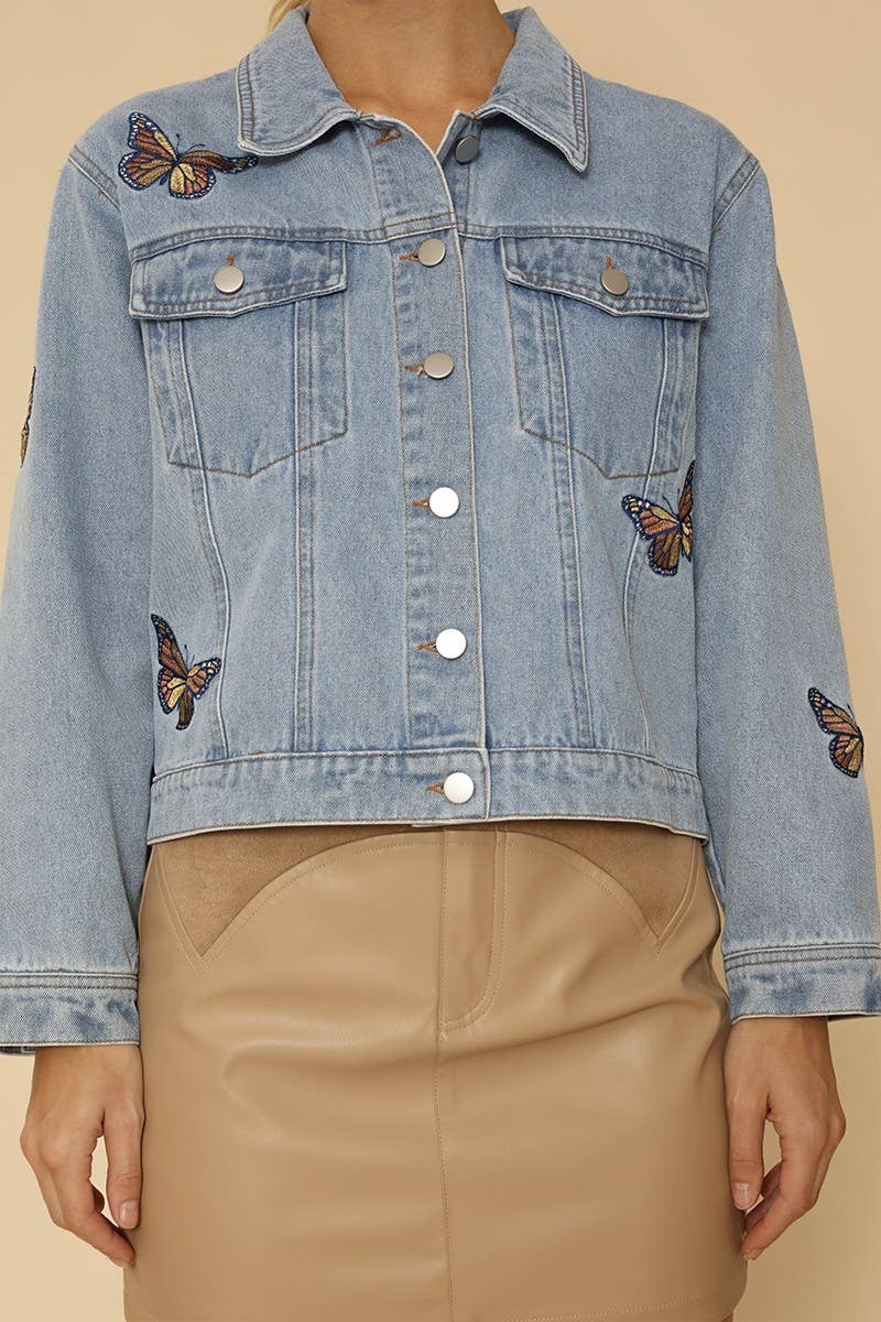 Miss Sparkling Light Blue Monarch Butterfly Embroidered Denim Jacket |