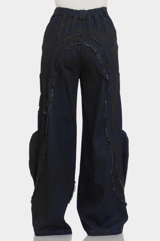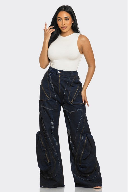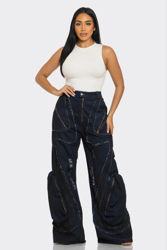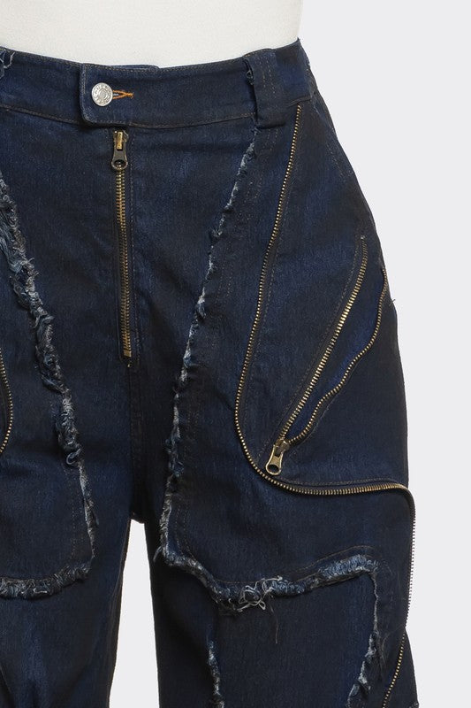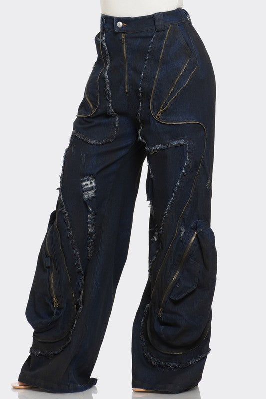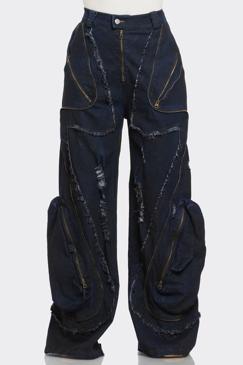 These cargo jeans present an urban nomadic twist to the streetwear wardrobe, featuring a complex array of zippers, pockets, and distressed denim details. The indigo hue is deepened by the contrasting gold-tone stitching, which outlines the jeans unique structure. Strategic distressing adds a rugged yet purposeful aesthetic, while the multitude of functional zippers and pockets underscore the utilitarian aspect of the design. Ideal for those who appreciate bold fashion statements and functional attire, these jeans are both an expression of style and practicality.