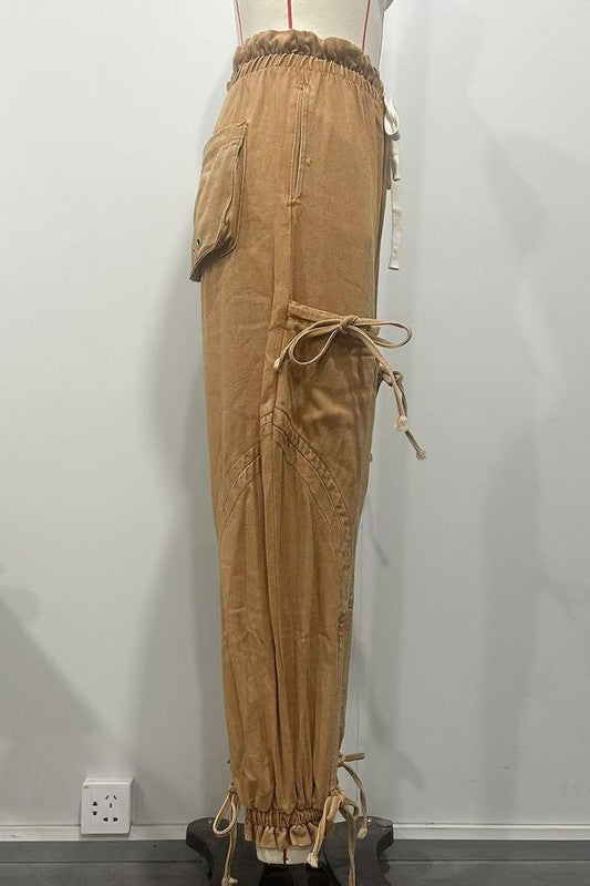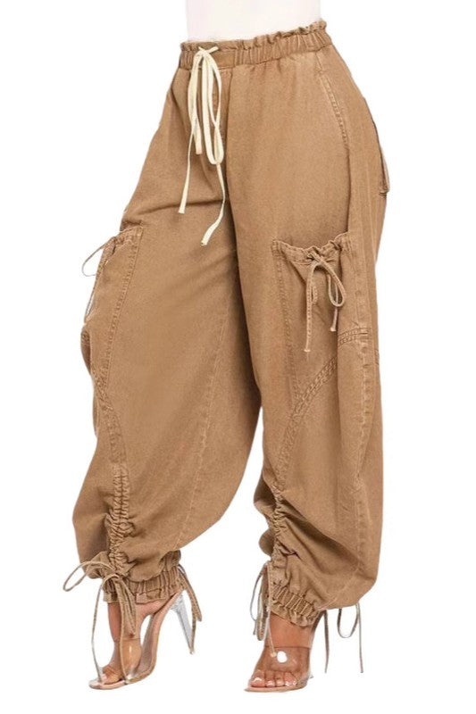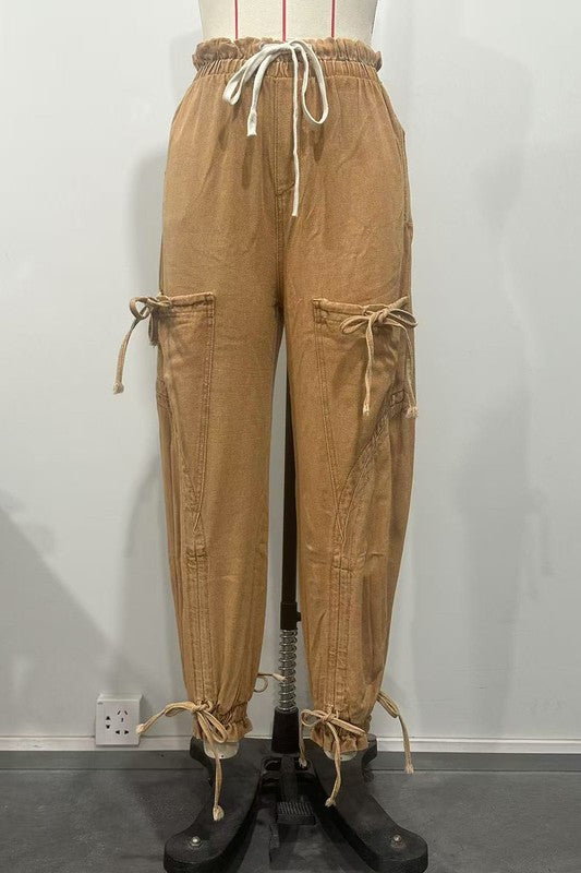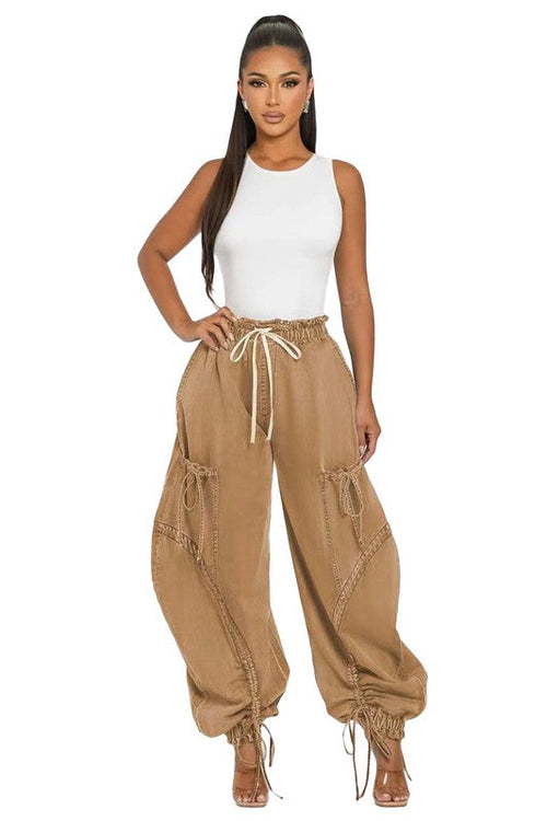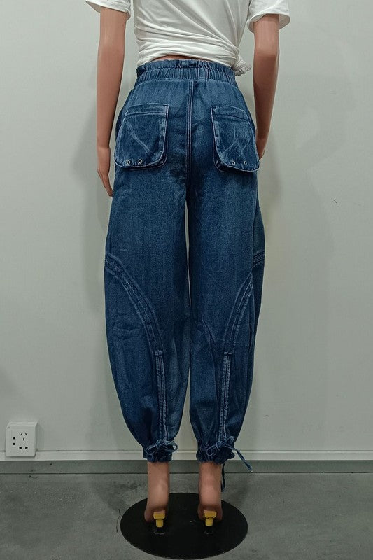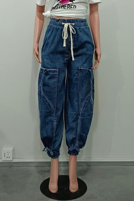 Details-harem denim pants, multi-pocket, elasticized waist, Drawstring ankle-length hems, oversized look